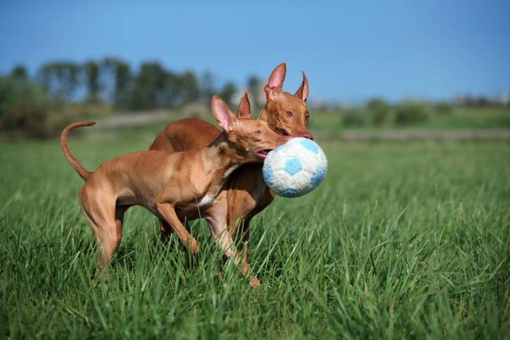 Deux Chiens du Pharaon en train de jouer avec un ballon de football