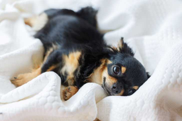 Un minuscule Chihuahua allongé sur une couverture blanche