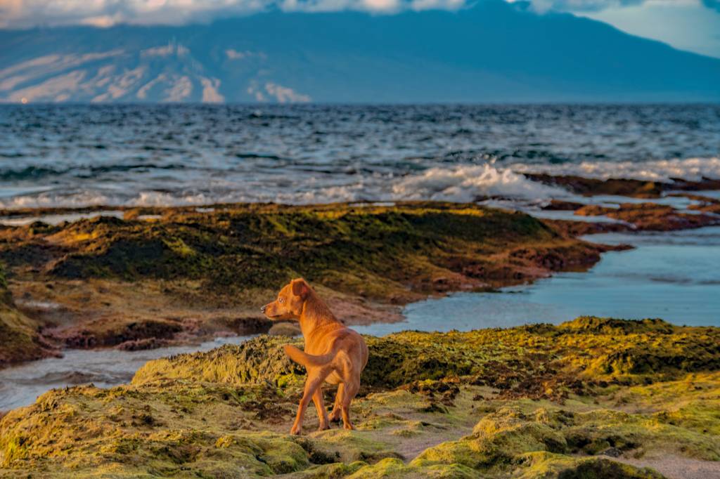 Un Chiweenie à la robe fauve et aux oreilles tombantes, sur des rochers