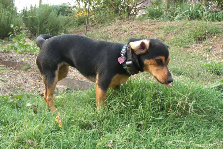 Un Chiweenie au pelage noir et fauve sur de l’herbe
