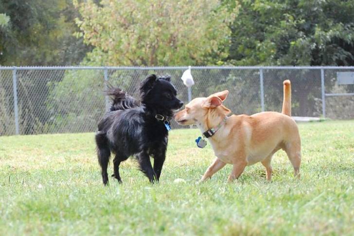 Deux Chiweenies, l’un au pelage noir et l’autre au pelage fauve, jouant sur de l’herbe