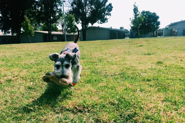 Un Chizer au pelage gris et blanc et aux oreilles tombantes, mordant une peluche dans sa gueule