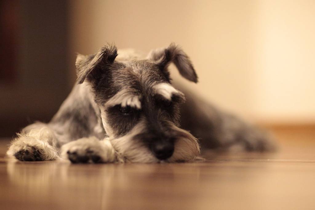 Un Chizer au pelage gris et aux oreilles tombantes, avec la gueule posée sur un parquet en bois