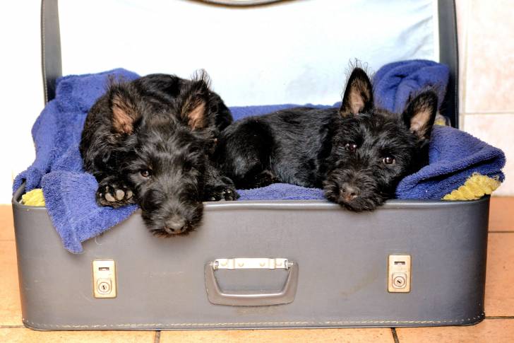 Deux chiots Chizers au pelage noir et aux oreilles dressées, allongés sur une couverture