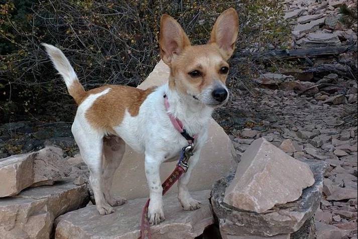Un Chorgi sur une pierre et qui est tenu en laisse