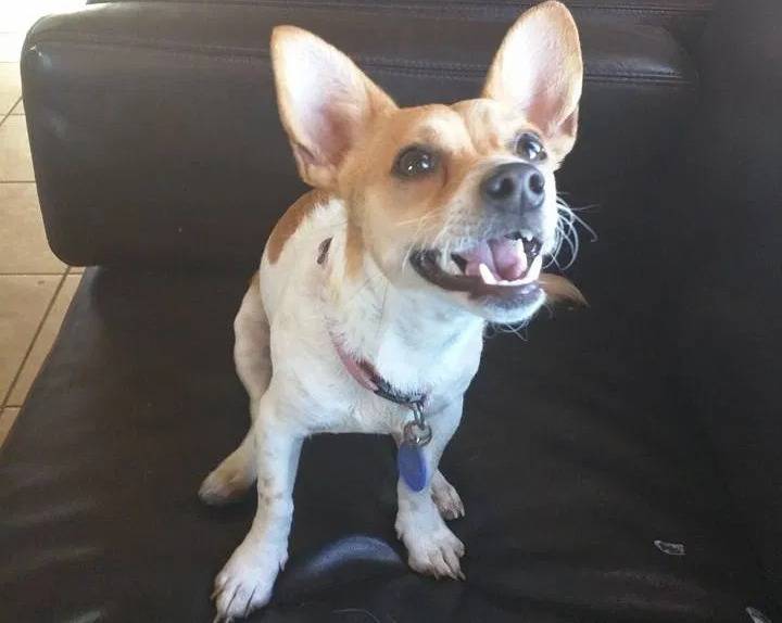 Un Chorgi sur un canapé et portant un collier autour du cou