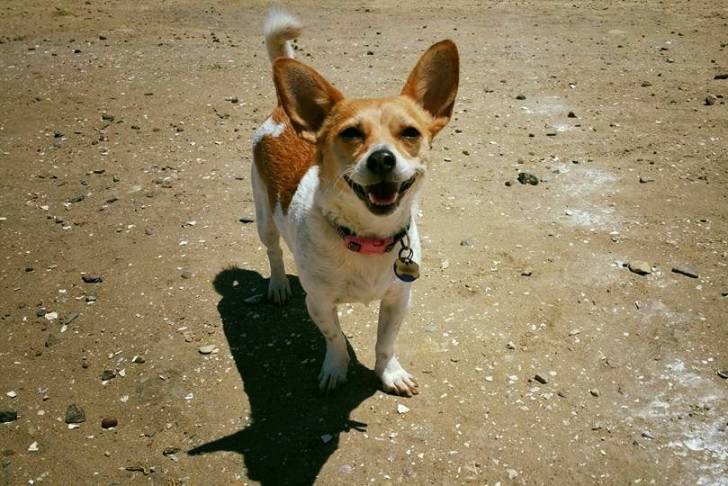Un Chorgi sur une surface sableuse et portant un collier autour du cou