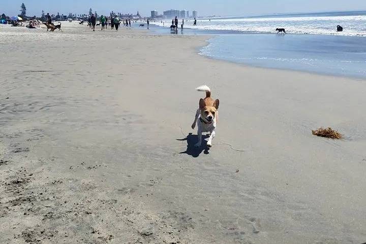 Un Chorgi courant sur une surface sableuse et portant un collier autour du cou