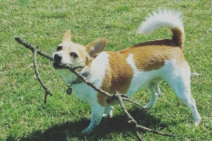 Un Chorgi portant un collier autour du cou et ayant une branche dans sa gueule