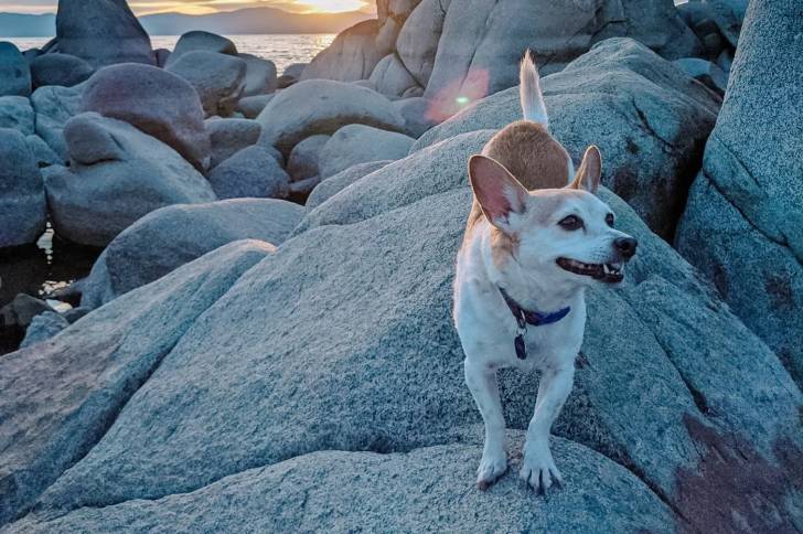 Un Chorgi sur un rocher et portant un collier autour du cou