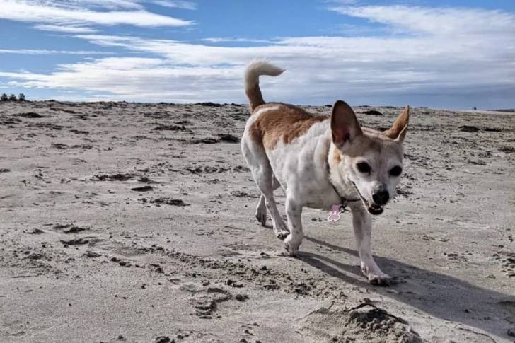Un Chorgi marchant sur une surface sableuse et portant un collier autour du cou