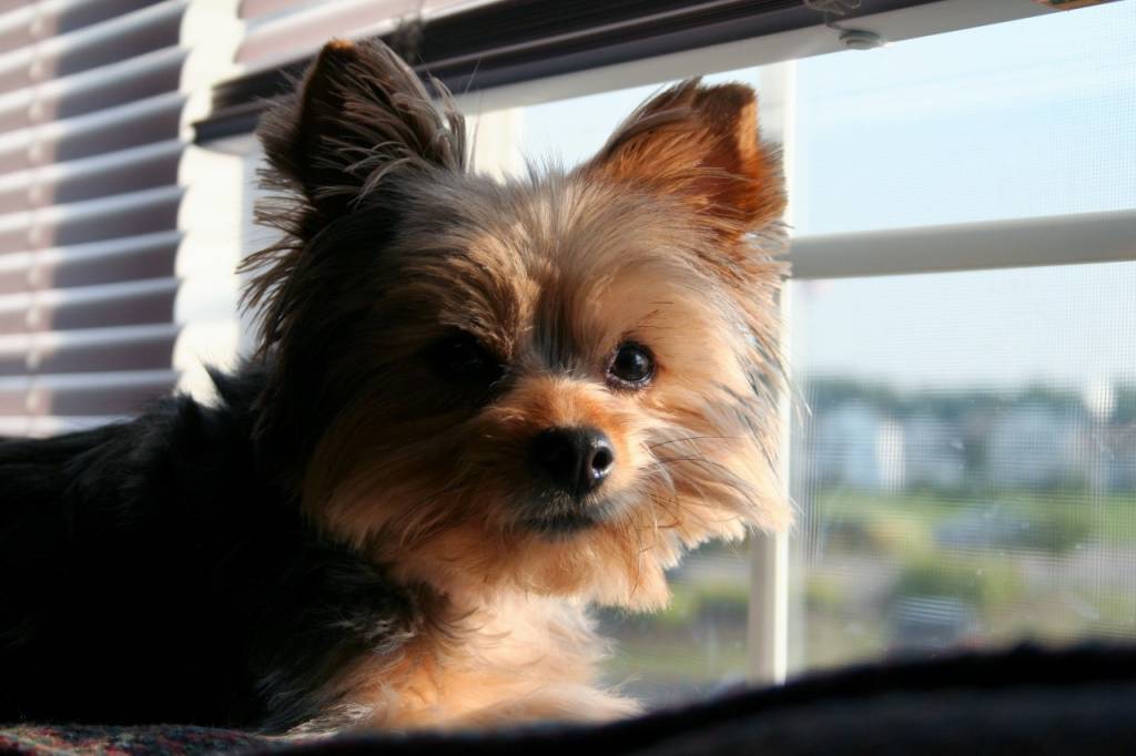 Un Chorkie au pelage noir et fauve, assis sur le rebord d'une fenêtre