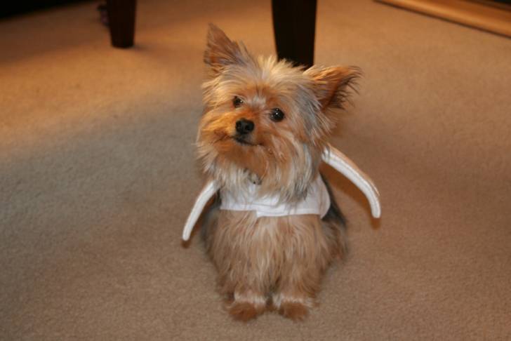 Un Chorkie au pelage gris acier et fauve, portant un manteau d'ange blanc