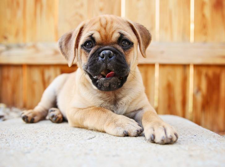 Un chiot Chug au pelage fauve, allongé sur du sable
