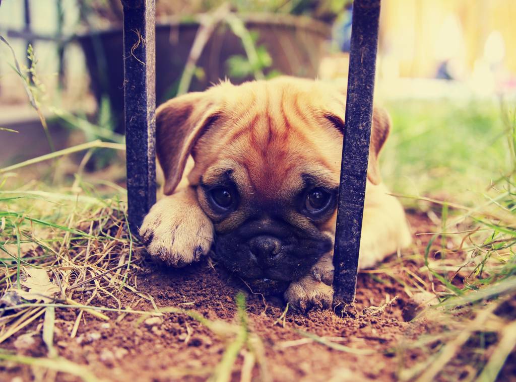 Un chiot Chug au pelage fauve, allongé entre les barreaux d'un jardin