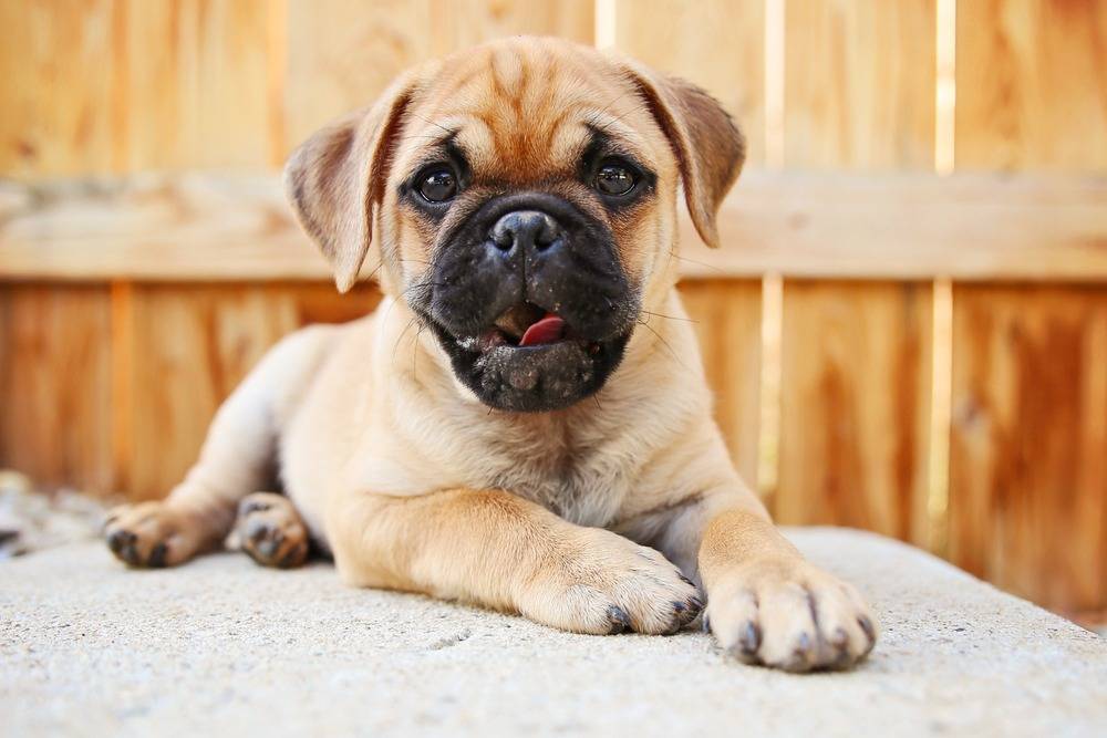 Un Chug allongé sur une surface en béton avec une clôture en bois en arrière-plan
