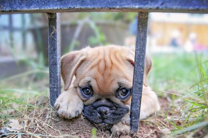 Un Chug au pelage fauve entre les barreaux d’une grille, ayant sa tête posée sur ses pattes