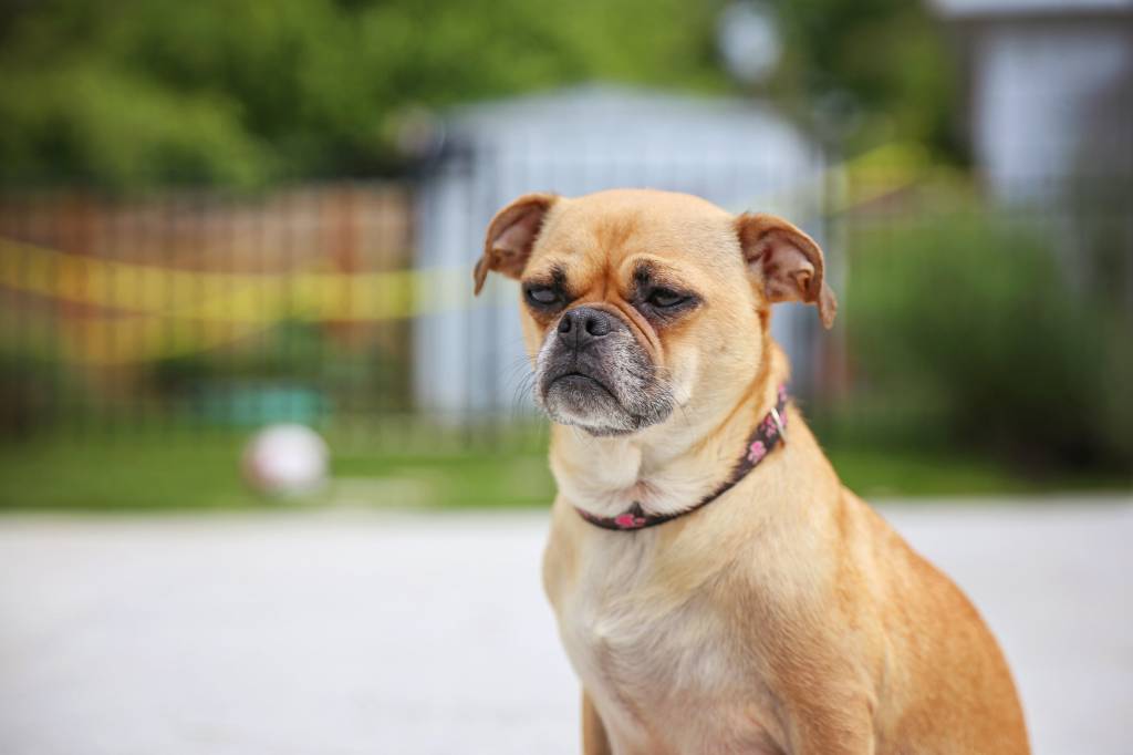 Un Chug à l’air grincheux, au pelage fauve et au museau noir, se tenant assis dans un parc
