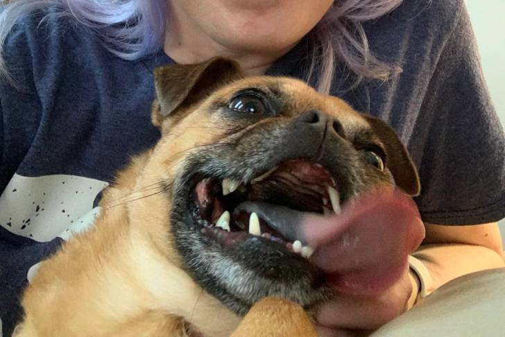 Photo montrant un Chug au pelage fauve et au museau noir, qui a la gueule bien ouverte.