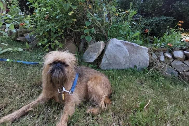 Un Chussel allongé sur un terrain herbeux et qui est tenu en laisse
