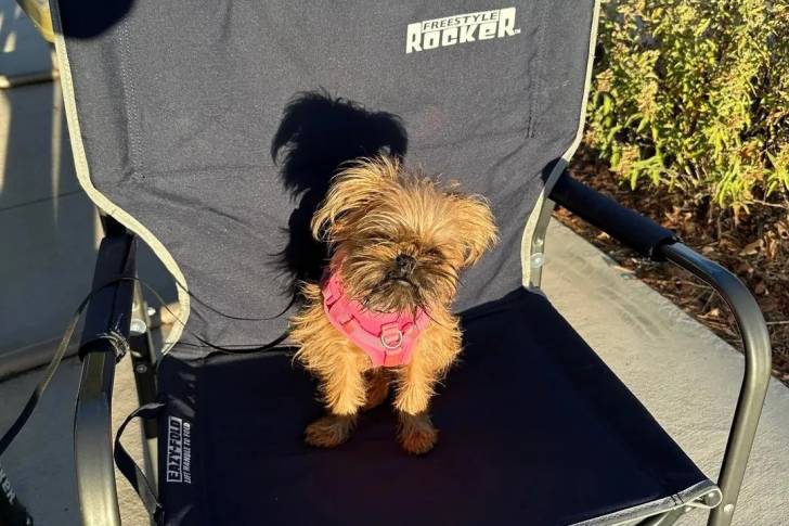 Un Chussel assis sur une chaise et portant un harnais