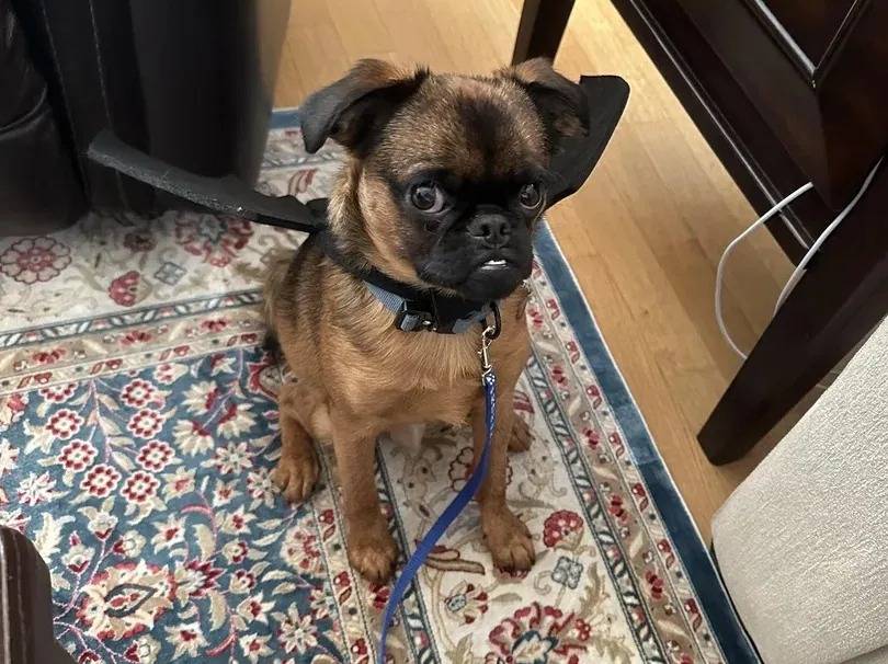 Un Chussel regardant vers la caméra et qui est tenu en laisse