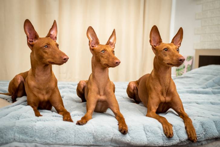 Un couple de Cirneco de l'Etna avec un Pitbull