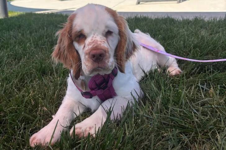 Un Clumber Spaniel allongé sur une surface gazonnée et qui est tenu en laisse