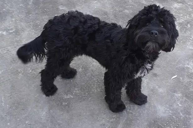 Un Cock-A-Tzu se tenant à quatre pattes sur une surface en béton