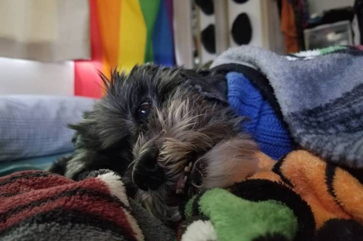 Un Cock-A-Tzu reposant confortablement sur un lit et enveloppé dans une couverture colorée