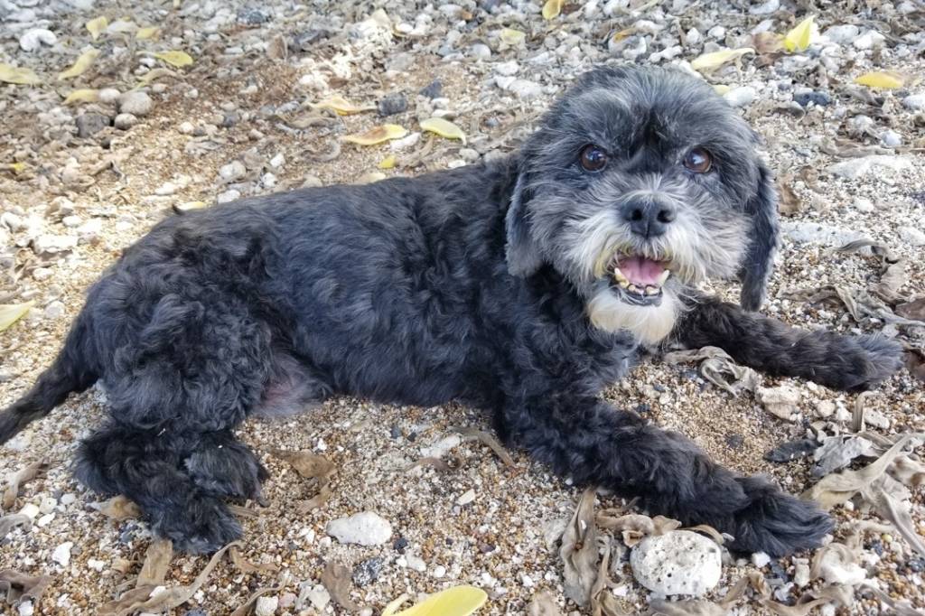 Un Cock-A-Tzu allongé sur un sol couvert de petits cailloux et de feuilles sèches