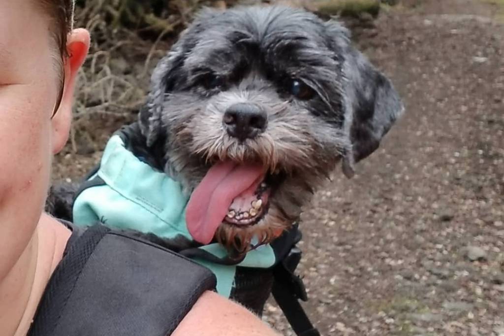 Photo d'un Cock-A-Tzu porté au dos par une personne dans une zone boisée