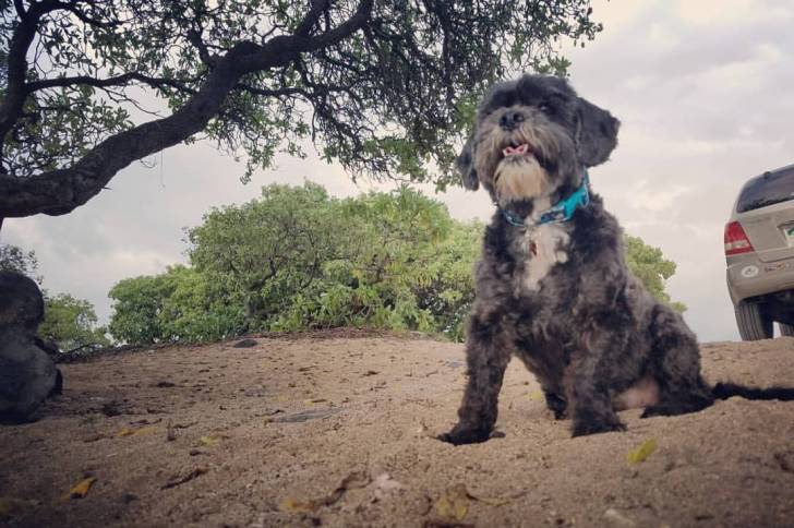 Un Cock-A-Tzu se tenant sur un terrain sablonneux sous un arbre