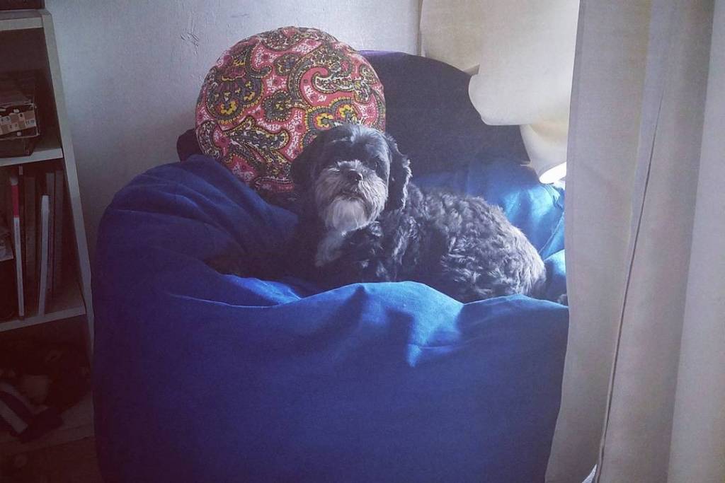 Un Cock-A-Tzu assis confortablement sur un grand pouf bleu dans une pièce bien éclairée