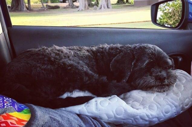 Un Cock-A-Tzu dormant paisiblement sur un coussin blanc à l’intérieur d’une voiture