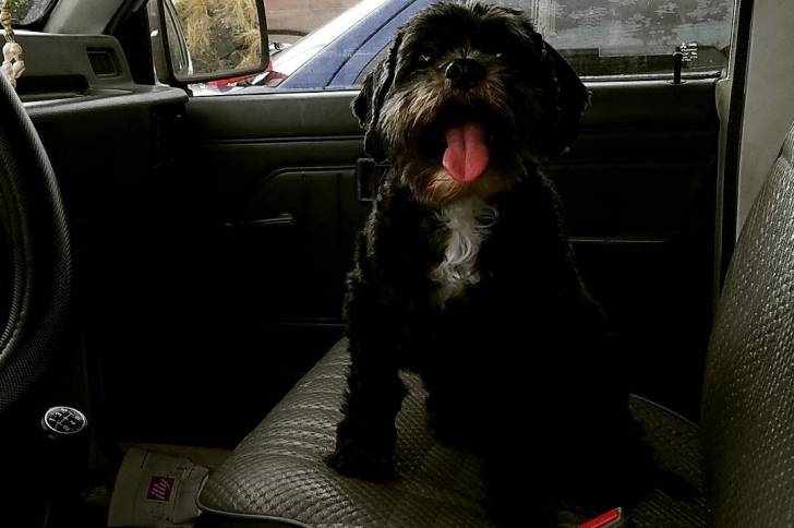 Un Cock-A-Tzu assis sur le siège arrière d'une voiture