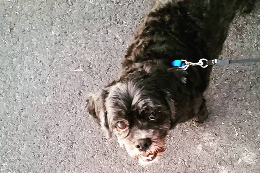 Un Cock-A-Tzu attaché à une laisse et se trouvant sur un sol en asphalte