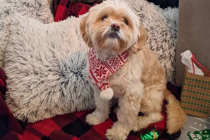 Un Cock-A-Tzu assis sur une couverture à carreaux rouge et noire avec un oreiller moelleux derrière