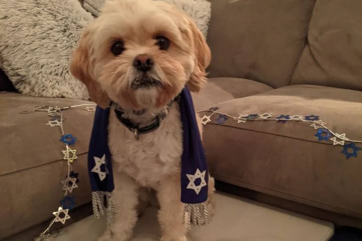 Un Cock-A-Tzu assis devant un canapé et portant une écharpe