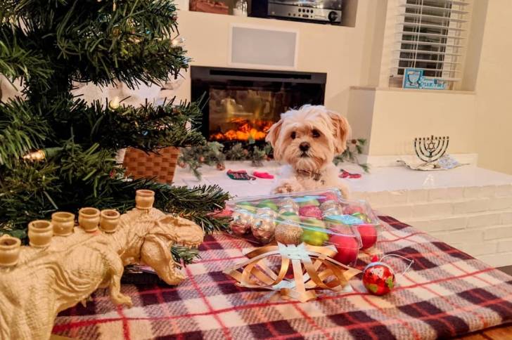 Un Cock-A-Tzu assis sur le sol dans un salon avec des décorations de Noel