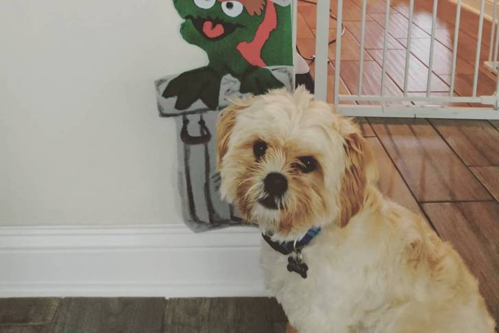 Un Cock-A-Tzu assis sur le sol d’une maison