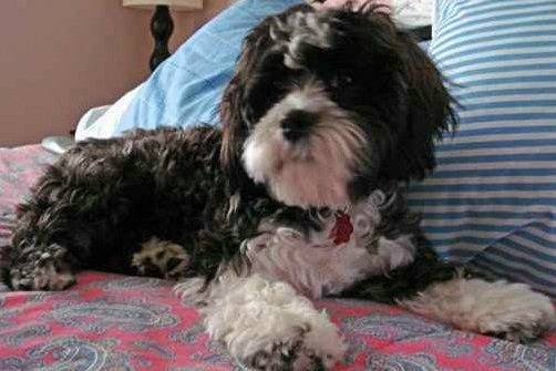 Un Cock-A-Tzu au pelage bicolore, allongé sur un lit