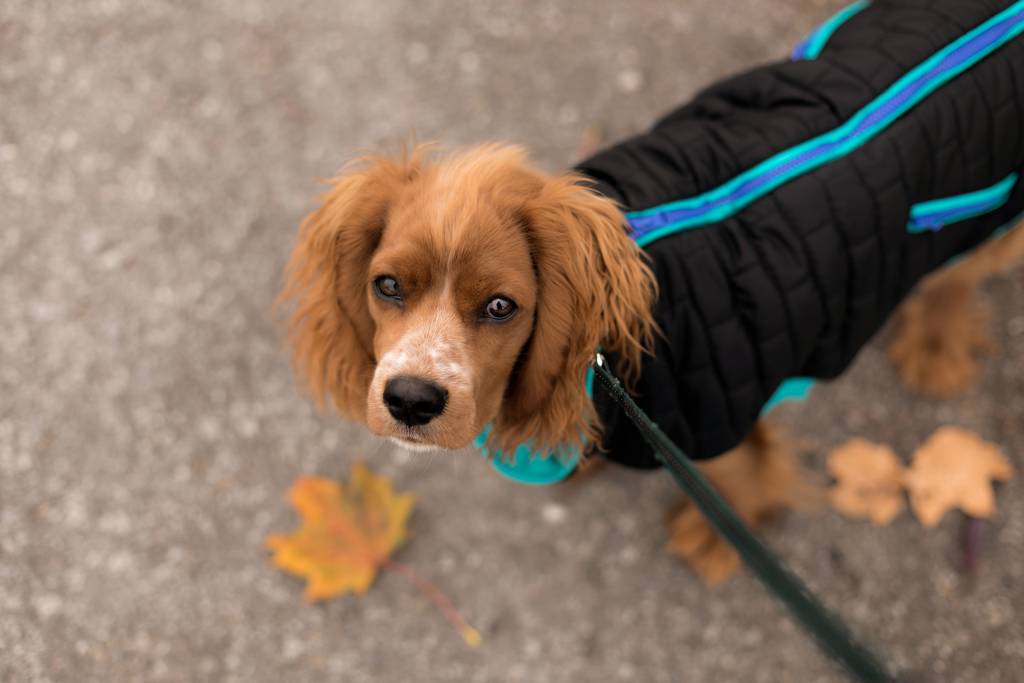 Un Cockalier au pelage roux, tenu en laisse et portant un manteau noir rayé de bleu