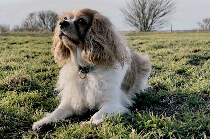 Un Cockalier au pelage Blenheim roux et blanc, allongé dans l'herbe
