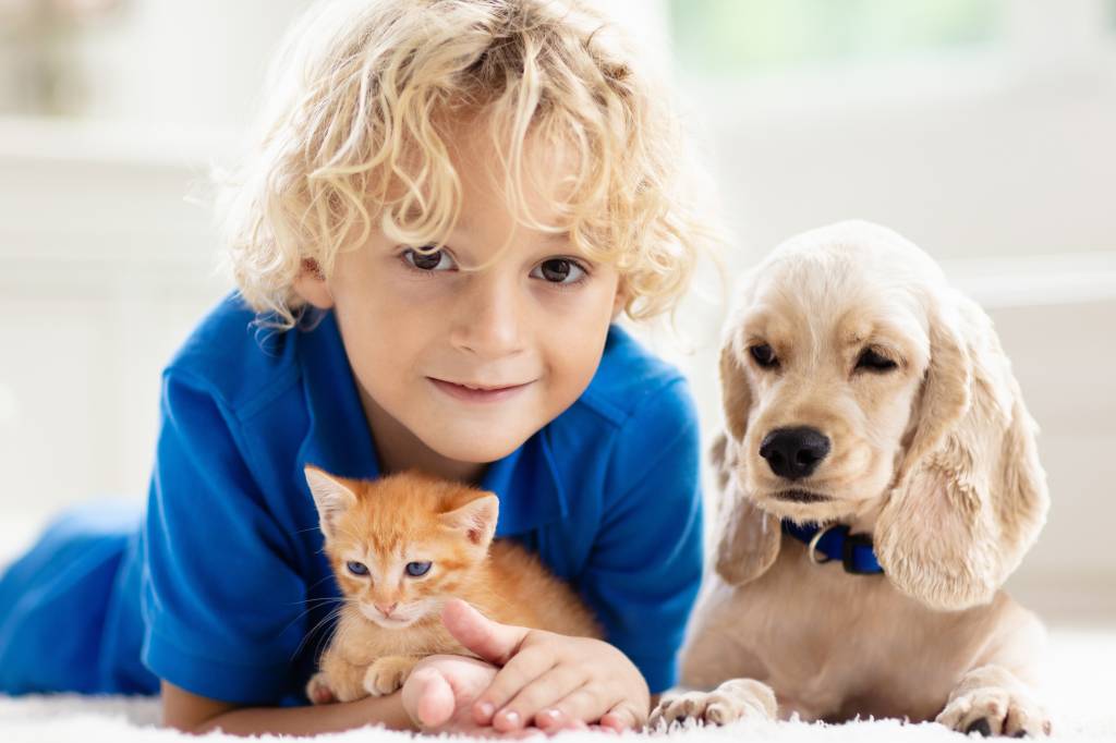 Un Cocker Américain allongé à côté d'un petit garçon avec un chaton