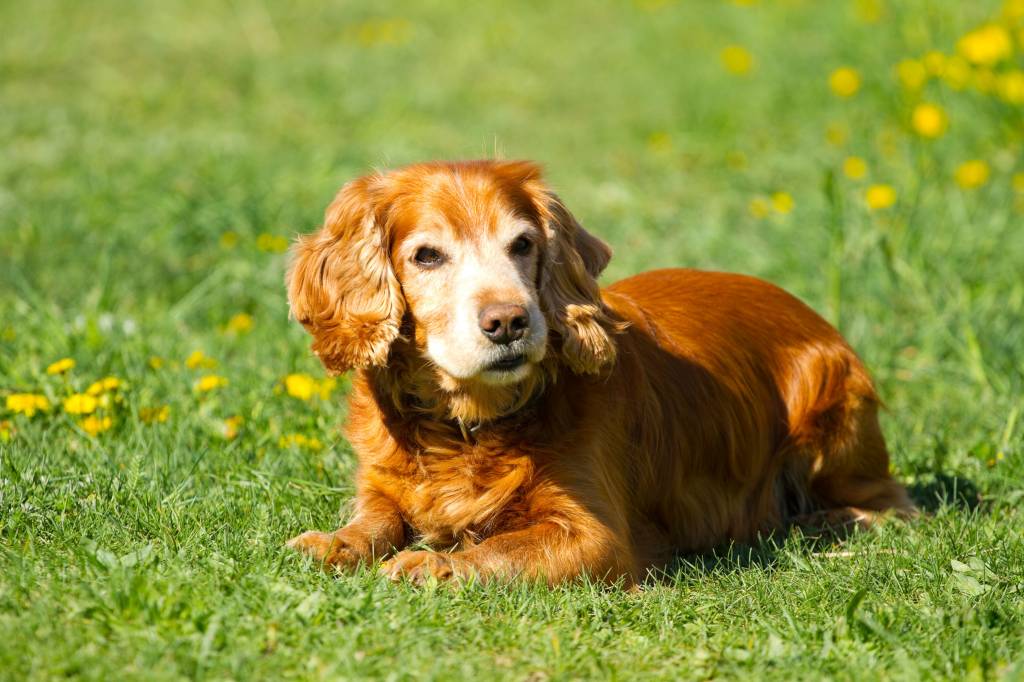 Un Cocker roux assis dans un champ