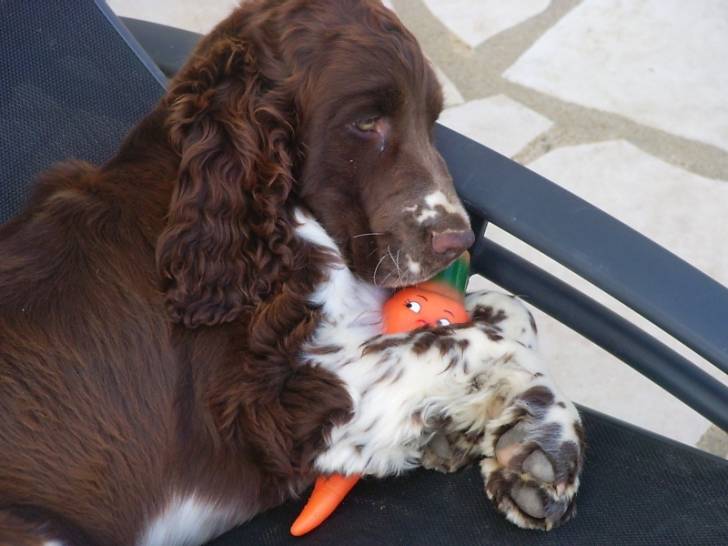 Hélios est un chiot English Springer Spaniel ou Cocker Anglais qui adore les jouet.