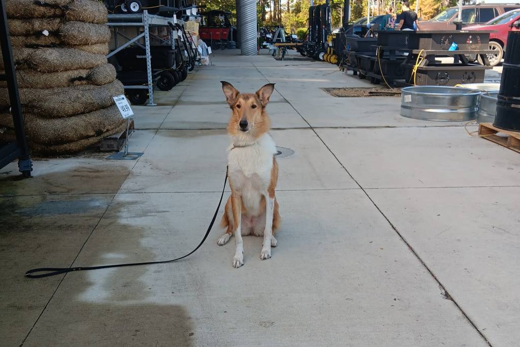 Un Colley à poil court assis sur une surface bétonnée et qui est tenu en laisse