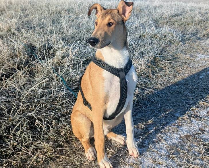 Un Colley à poil court assis sur un terrain herbeux et portant un harnais