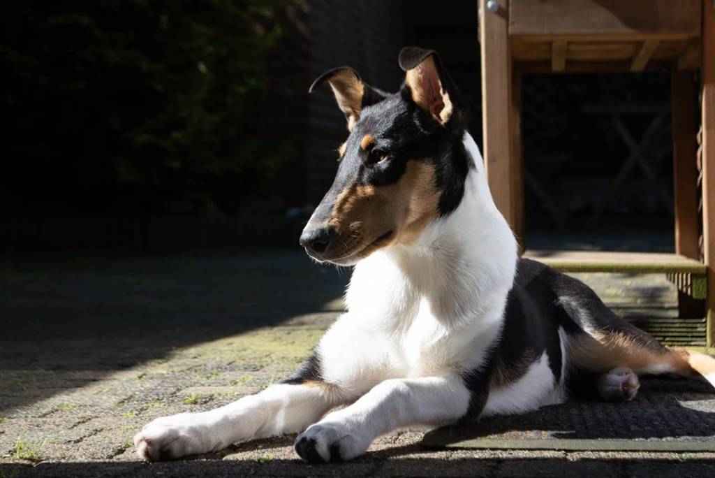 Un Colley à poil court allongé sur un tapis et semblant détendu